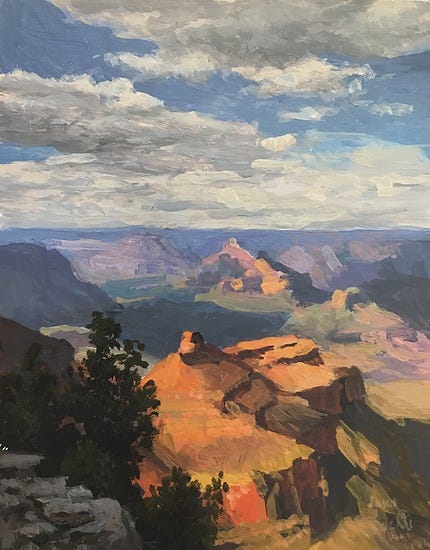 I use a limited oil paint palette and I mix a variety of energetic and passionate colors. I paint with dynamic and expressive, but also deliberate and calm, brushstrokes.