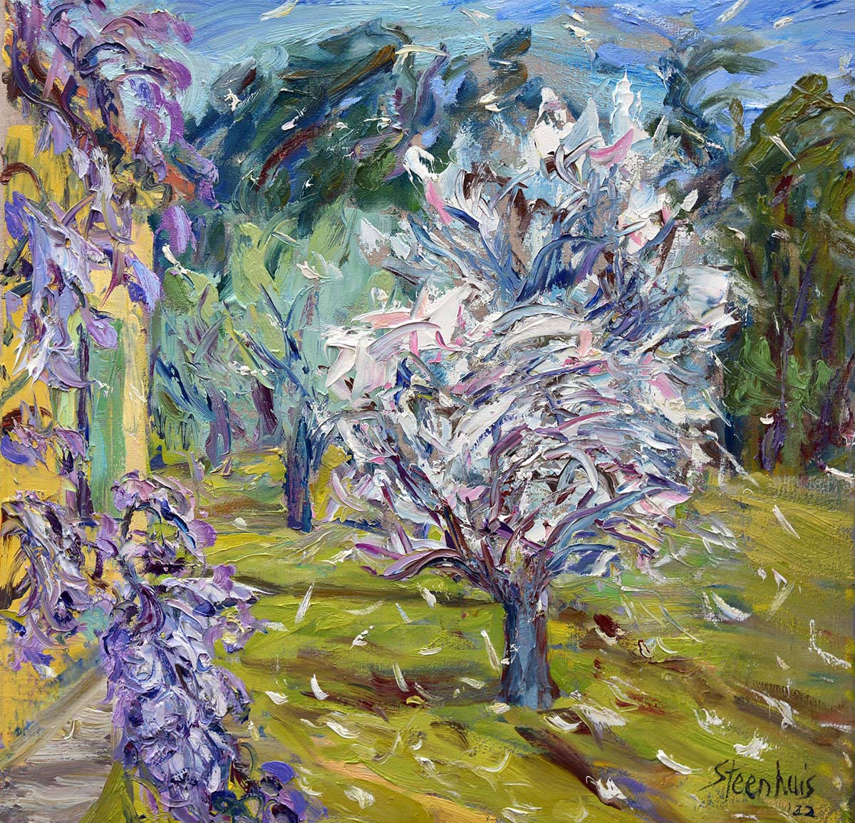 Jill Steenhuis, an American from Atlanta, Georgia, received her BFA in studio art from Sweet Briar College in Virginia in 1980. Following graduation, she journeyed to the south of France to discover Cezanne’s Mont Sainte Victoire and entered The Marchutz School of Fine Arts in Aix-en-Provence. She became a full-time painter and spent 14 years working out of Cézanne’s studio at the Château Noir.